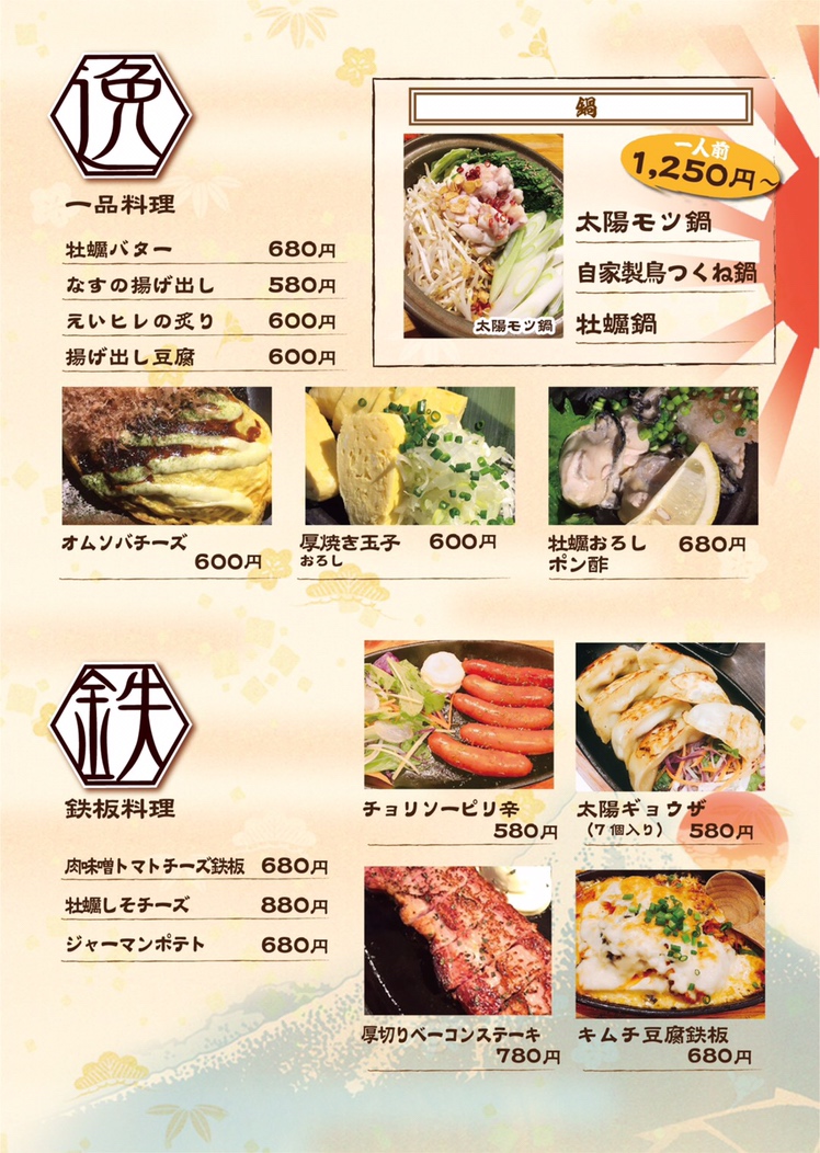 最後の締めにあうお料理もご用意しておりますが、ラーメンや太陽おじややお茶漬けとございますので箸休めをしたい時や、胃を落ち着かせたい時、お酒を飲んでいて一休みしたい時と各シーンでお役立てください。