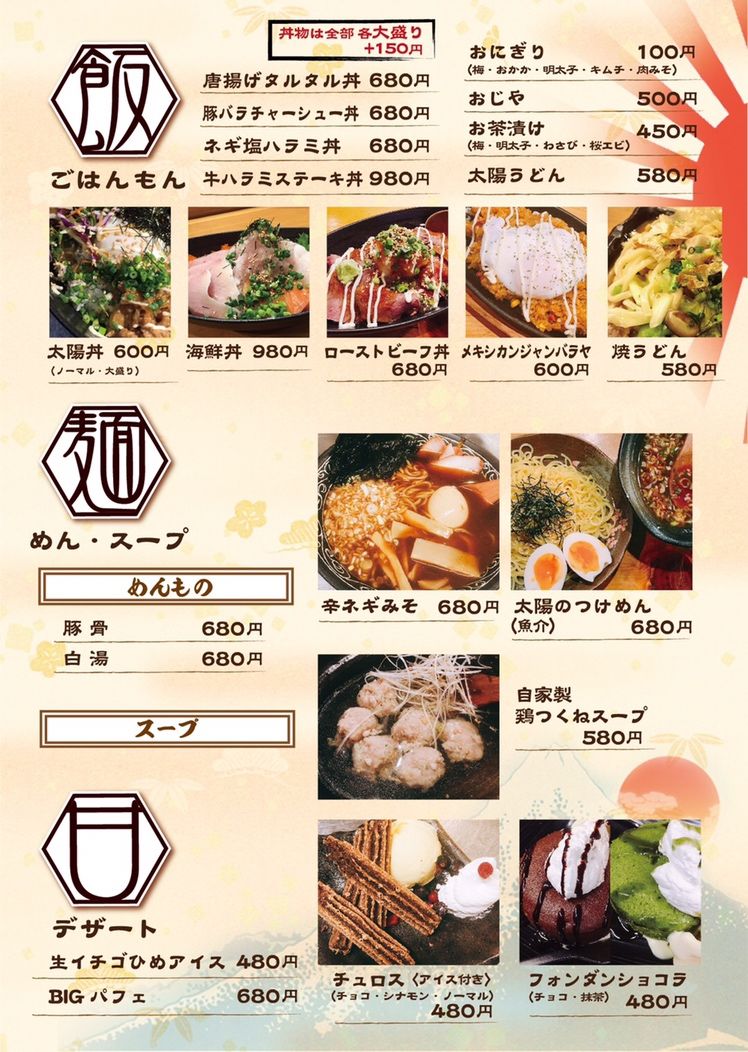 本日のデザートや太陽パフェ~Big~もございますが、甘いものがお好きな方にもおすすめです。